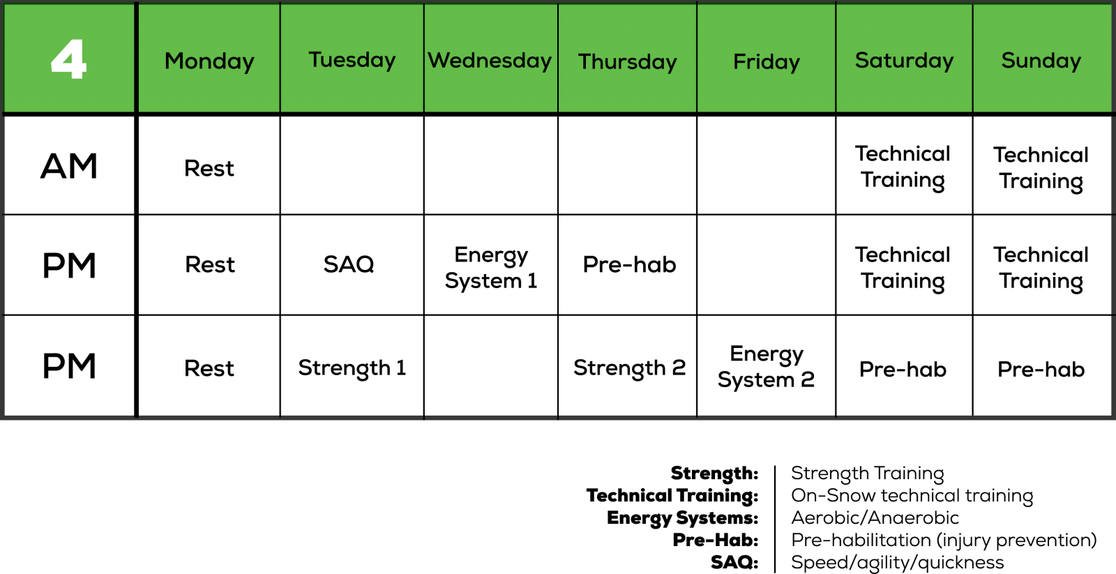 Wondering what a typical week should look like for a Stage 4 snowboard athlete? Check out the sample weekly schedule below.