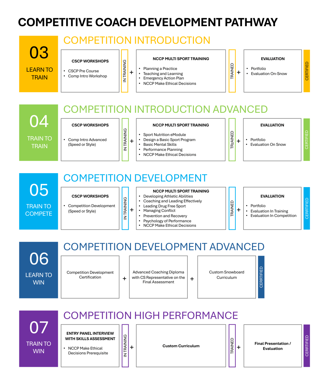 This pathway also mirrors the stages of the Long Term Athlete Development (LTAD) plan. Stages 1-2 athletes are led by Instructors at snow-schools, so our coaching pathway begins with Stage 3.