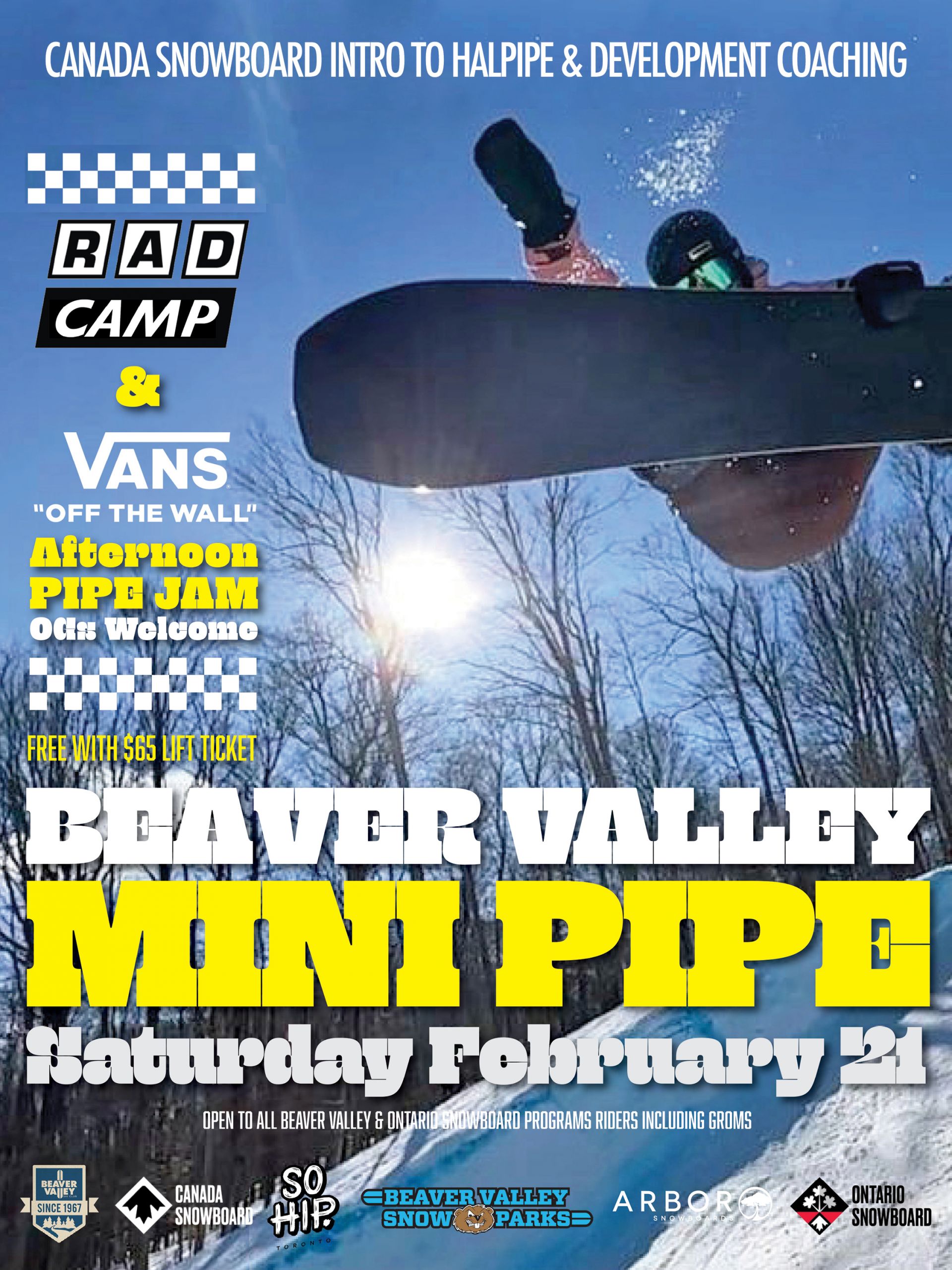 Rejoignez l'équipe du Beaver Valley Ski Club pour célébrer et réintroduire le halfpipe dans la station ! Cette journée est axée sur un format pipe-jam amusant avec votre famille et vos amis, avec le soutien de VANS, Arbor Snowboards, Ontario Snowboard, et bien d'autres. Nous sommes prêts à passer un moment agréable sans la pression de la compétition (mais peut-être pourrons-nous vous préparer pour les Jr Nationals Halfpipe le 12 mars !)